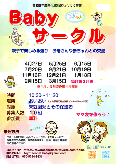 ◆2020年度 : 親子ふれあい遊び、Babyサークル、イライラしないママになるまほうの講座、親子でスキンシップたいむ講座、親子で楽しくあそぼまい、子育てカラー講座、離乳食講座、とよた子育て支援総合webサイト"わいわい"